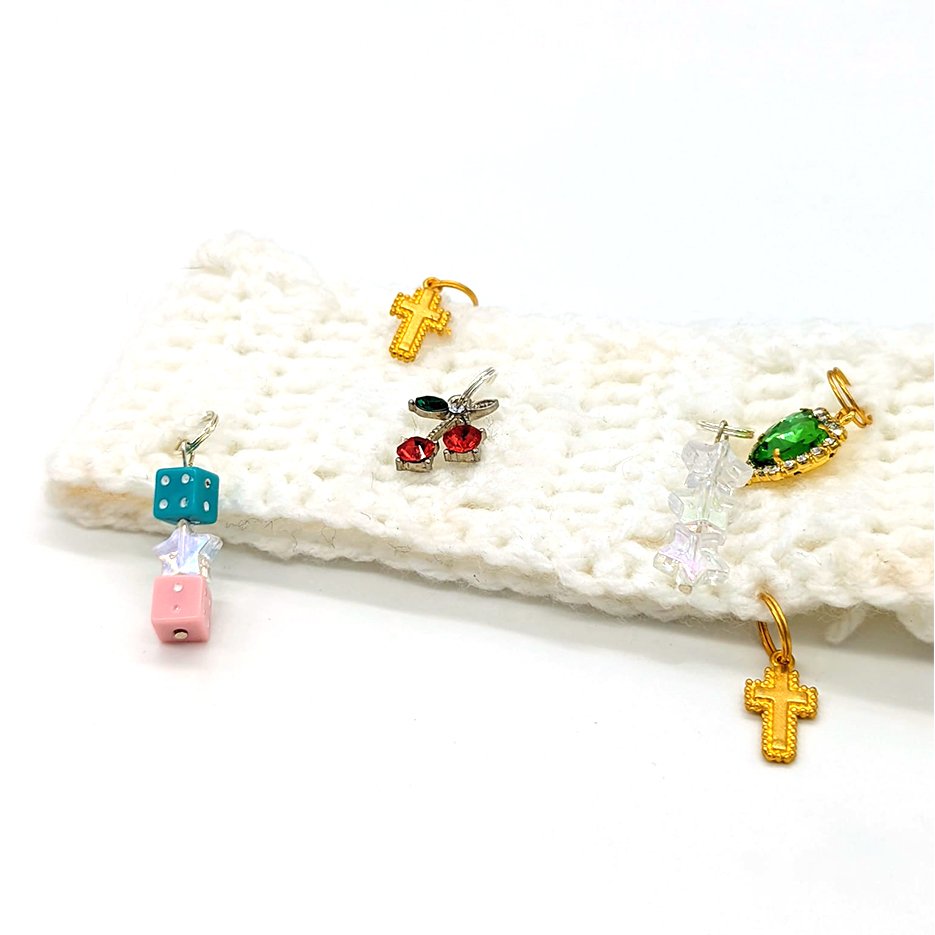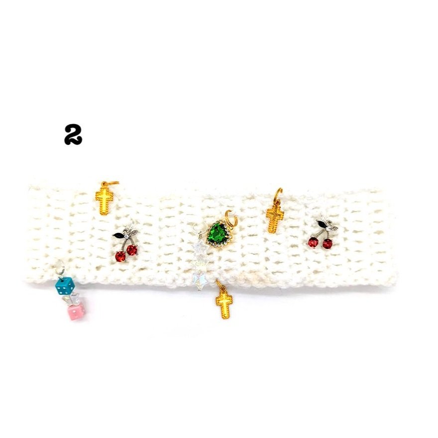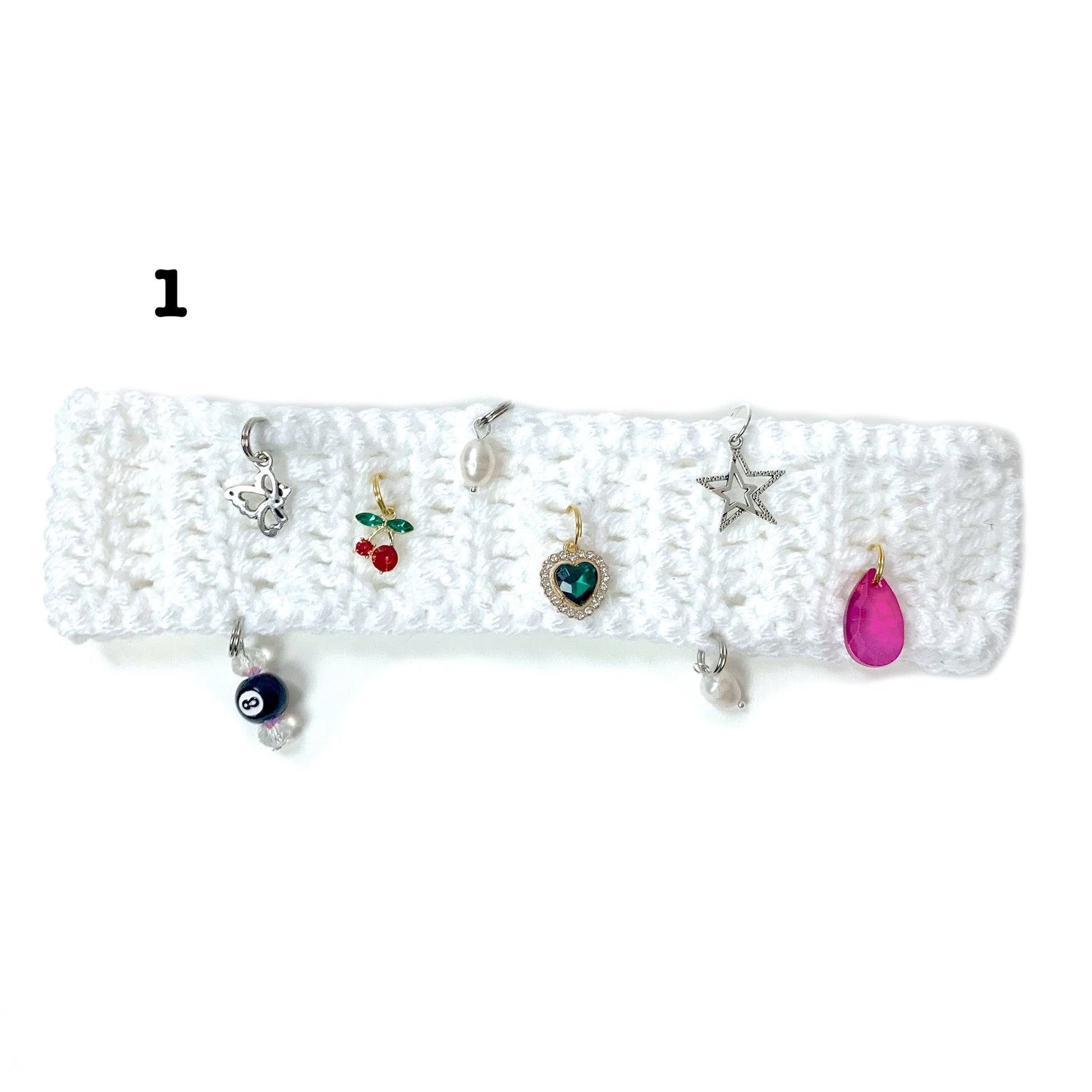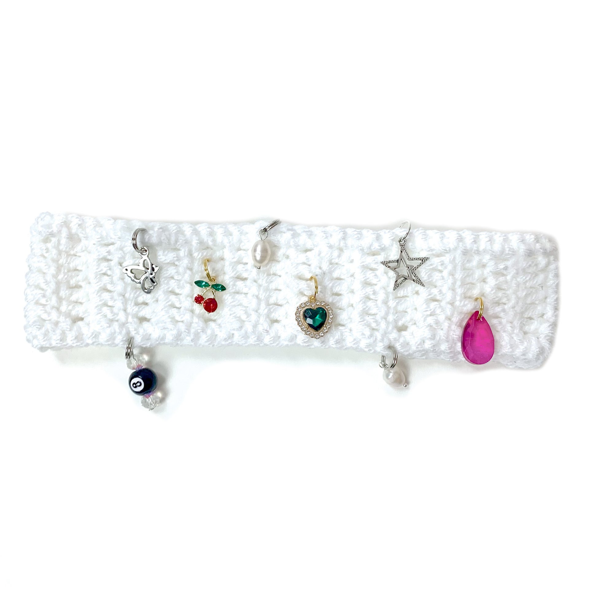White crochet headband with charms. Each headband is unique, the charm layout may be different from picture shown.