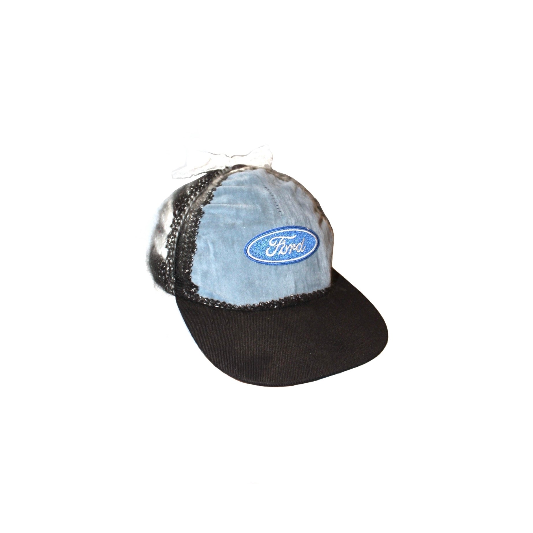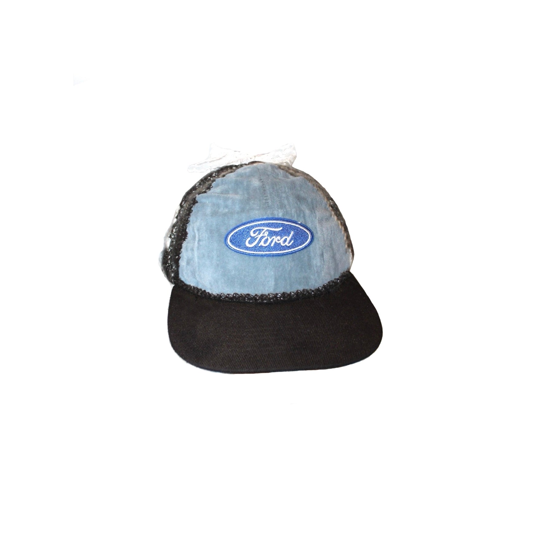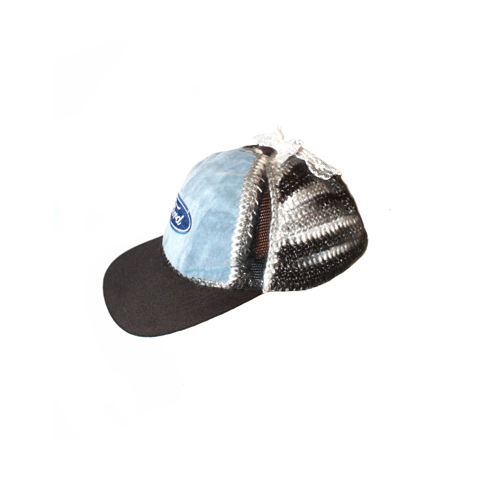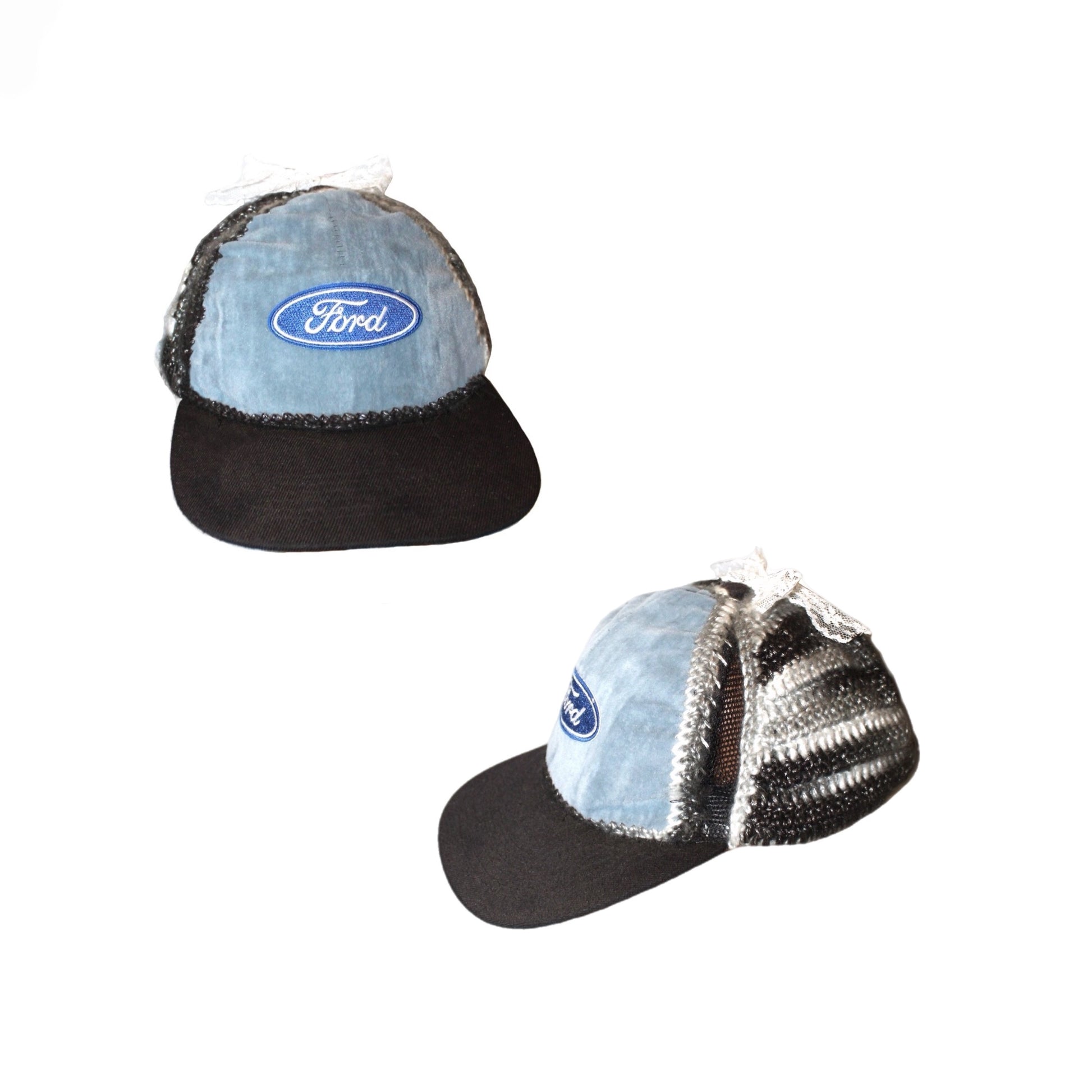 Ford Patch hat with blue authentic suede, crochet, and lace details.