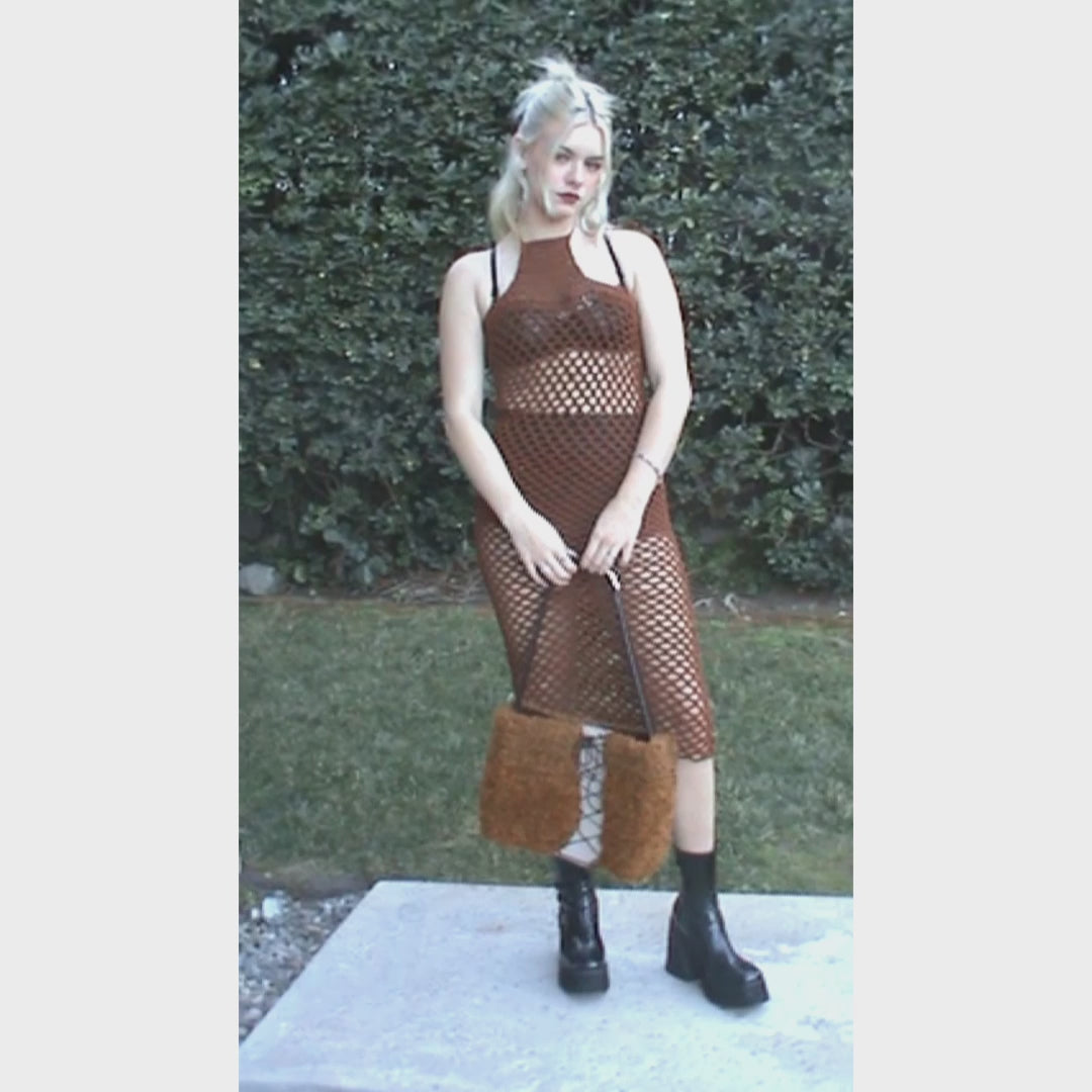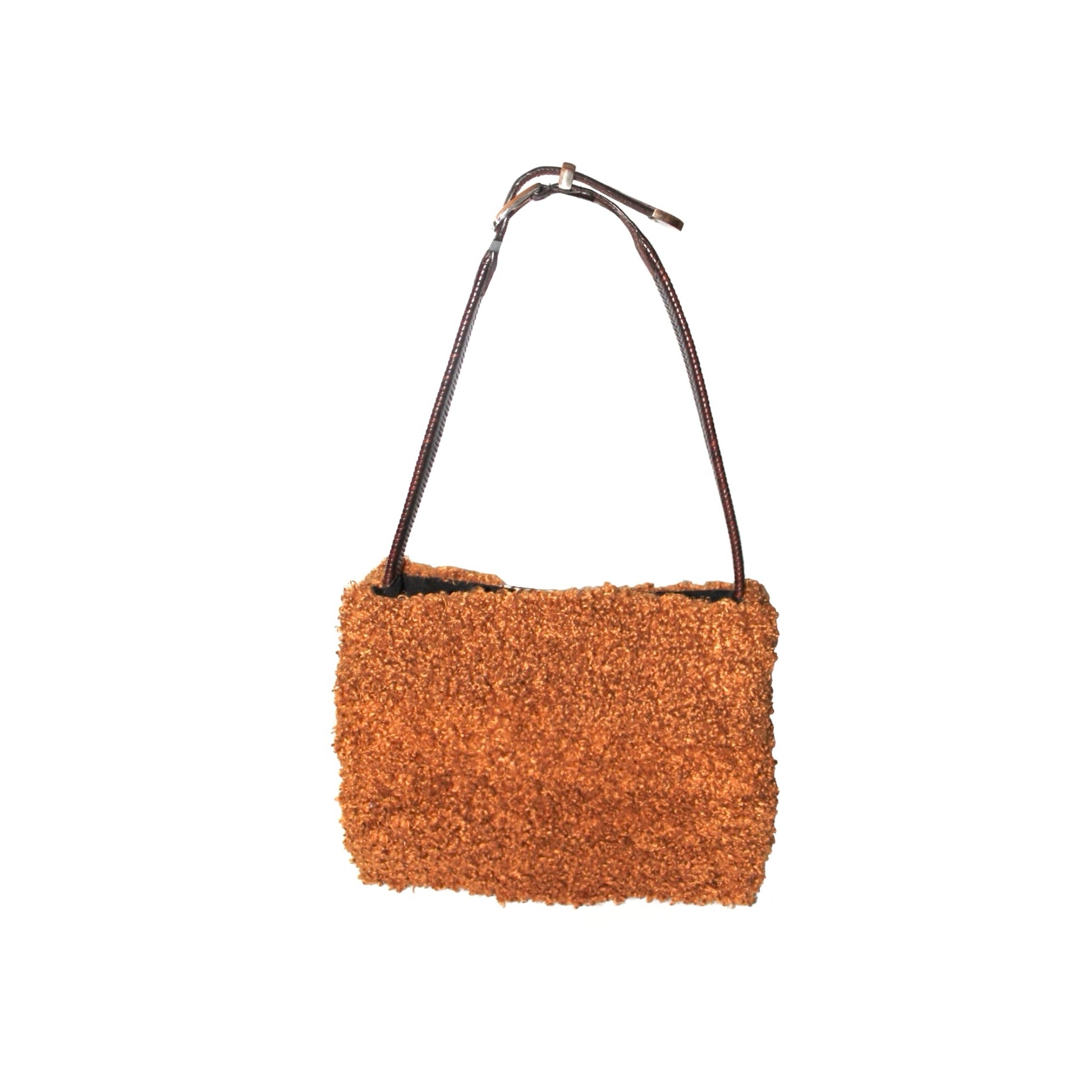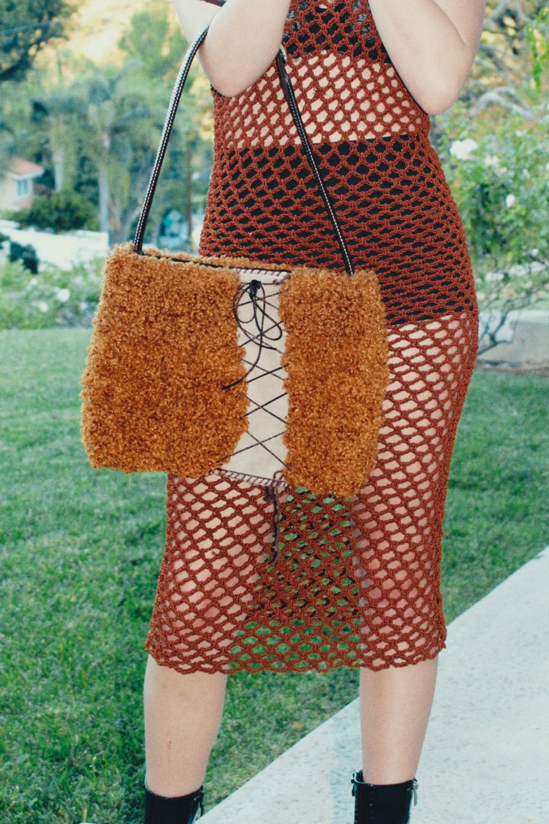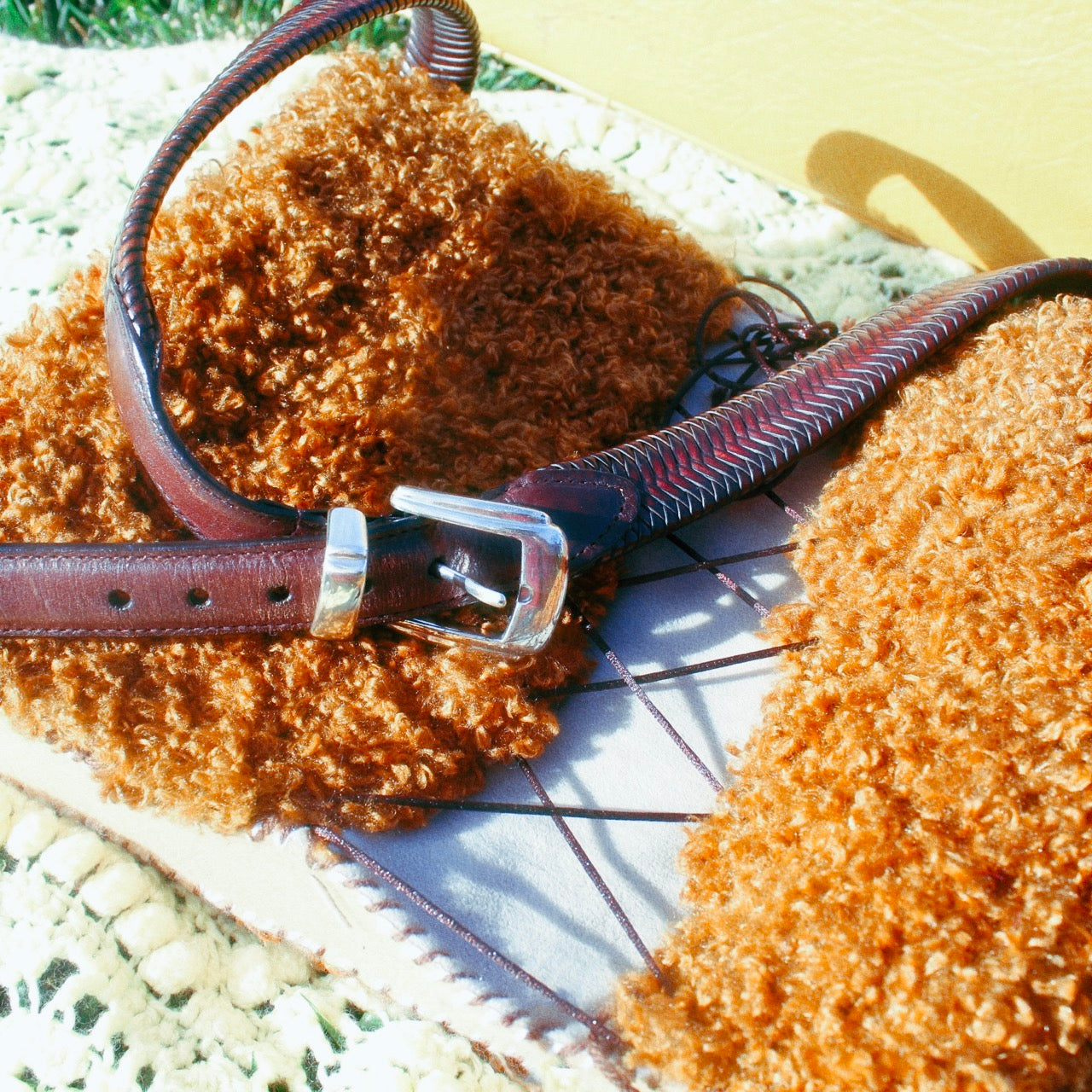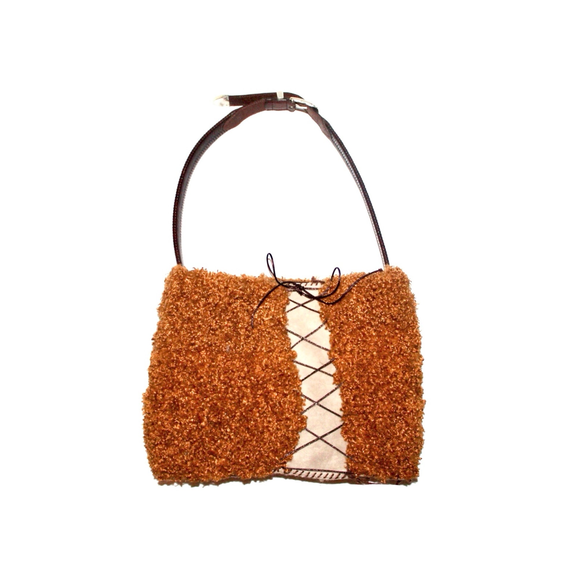 The Teddy Bear Buckle Bag is hand crafted using mesh canvas, furry chunky crochet, and a vintage belt buckle strap. Inside is lined with black felt.