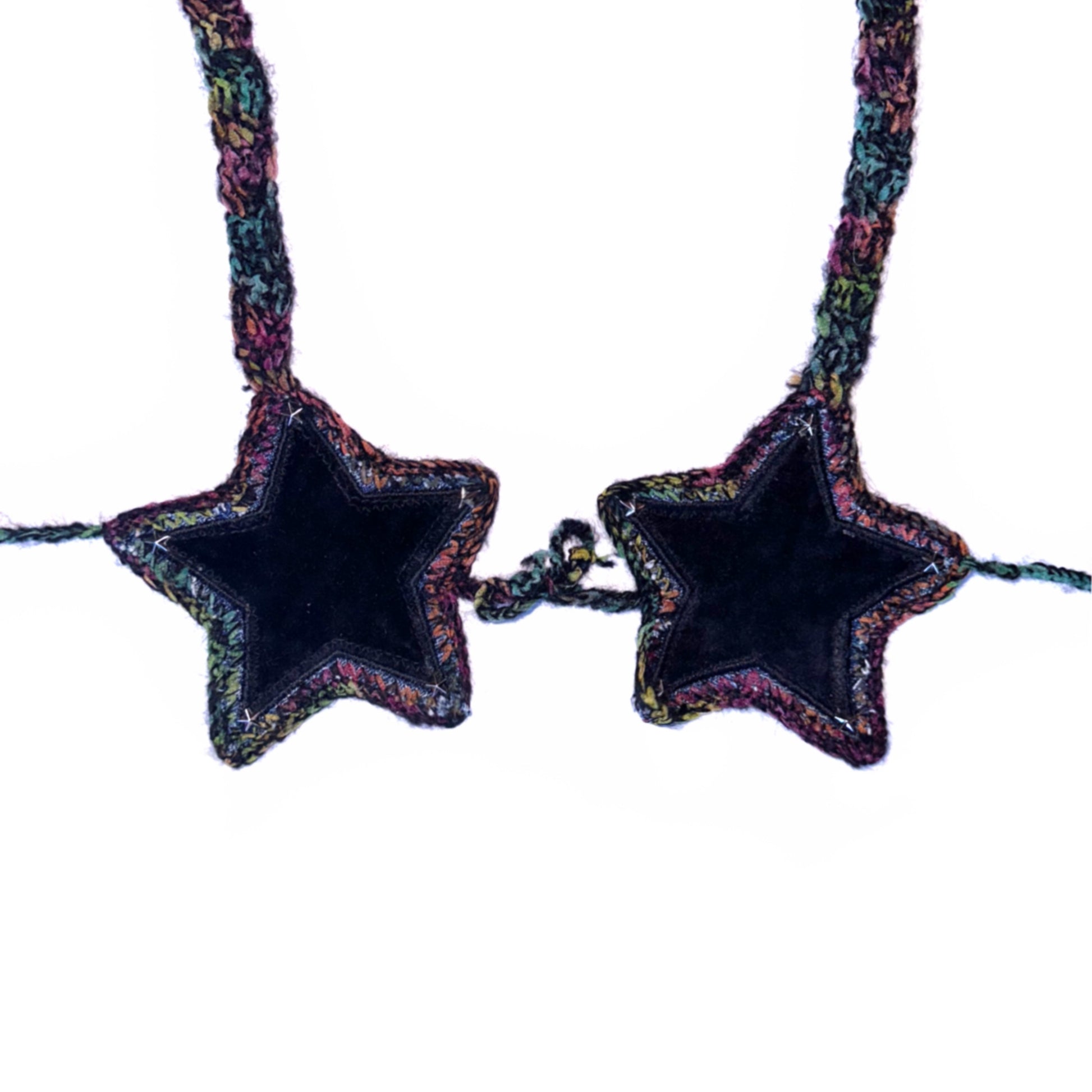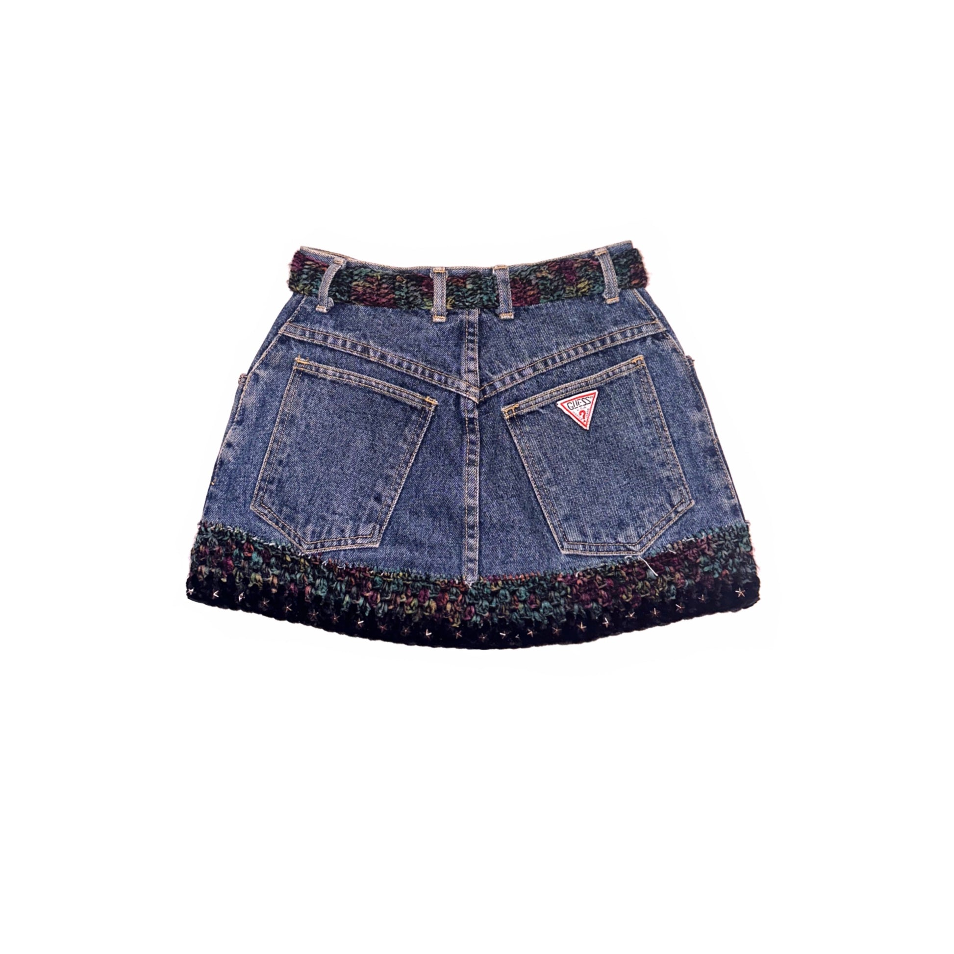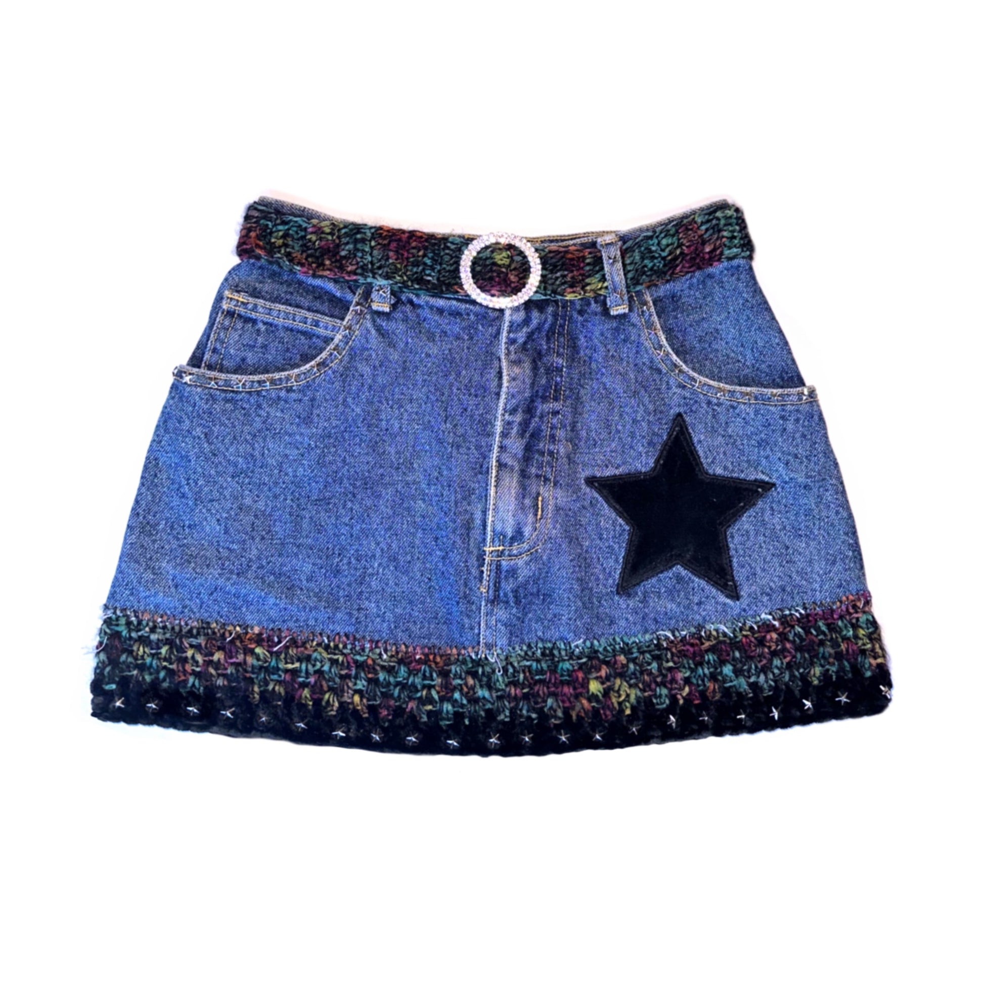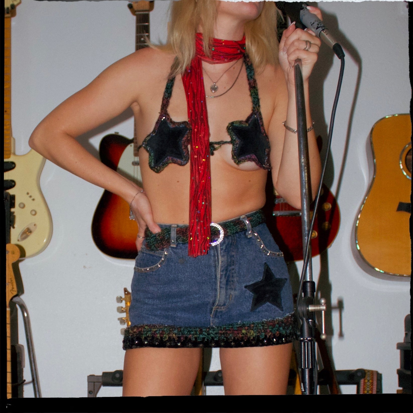 Vintage Jean Guess Skirt Revamped into a Two Piece Velvet Star Bra and Mini Skirt with Crochet Trim and Rhinestone Buckle Belt.